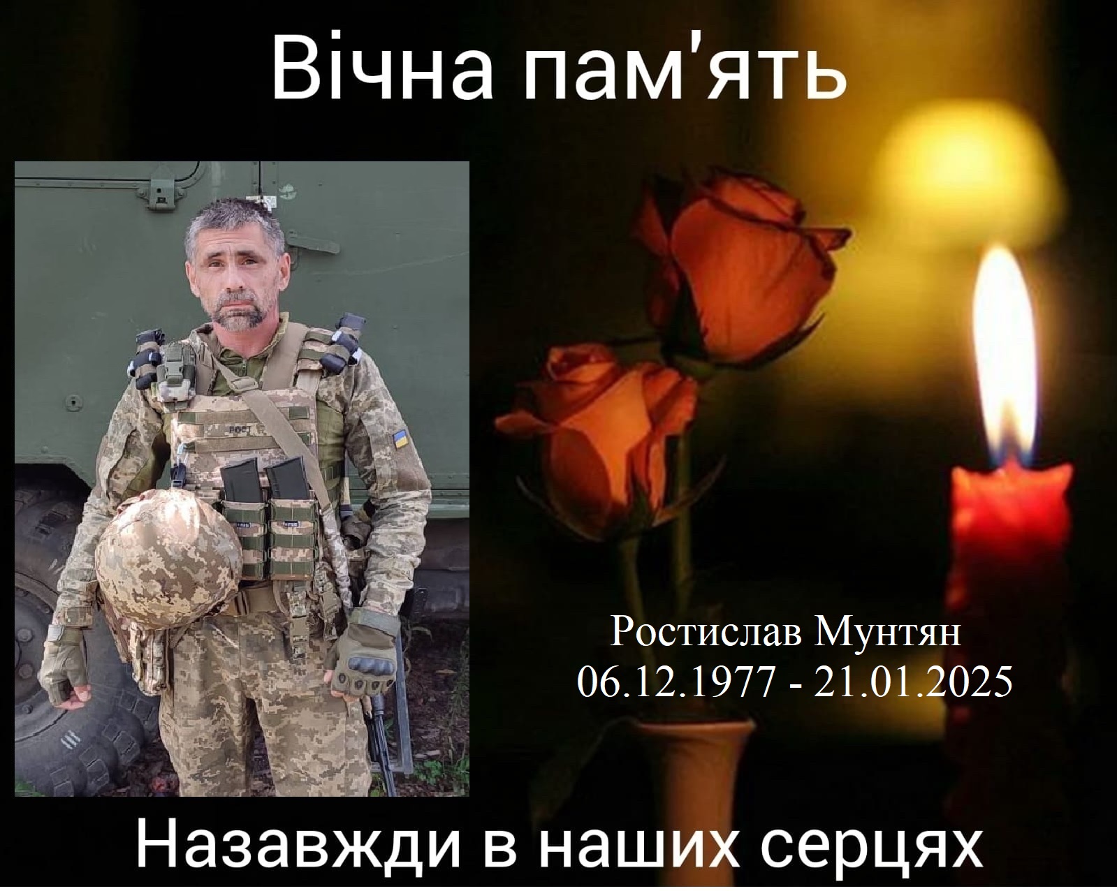Молодший сержант Ростислав Мунтян народився 6 грудня 1977 року. Командир вiддiлення радiоелектронної боротьби з безпiлотними лiтальними апаратами. Вважався зниклим безвiсти. Вiрний присязi, загинув 21 сiчня 2025 року в районi населеного пункту Миколаєво-Дар’їно Суджанського району Курської областi рф пiд час безпосередньої участi у бойових дiях.
