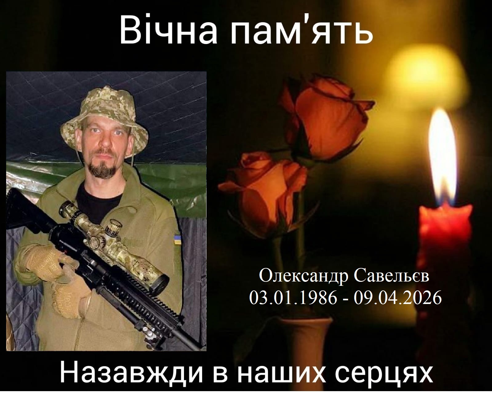 Старший солдат Олександр Савельєв народився 3 сiчня 1986 року. Оператор безпiлотних лiтальних апаратiв – розвiдник розвiдувального вiддiлення. Вiрний Вiйськовiй присязi, мужньо виконуючи вiйськовий обов’язок, загинув 09 квiтня 2026 року пiд час виконання бойового завдання поблизу населеного пункту Осикове Краматорського району Донецької областi.