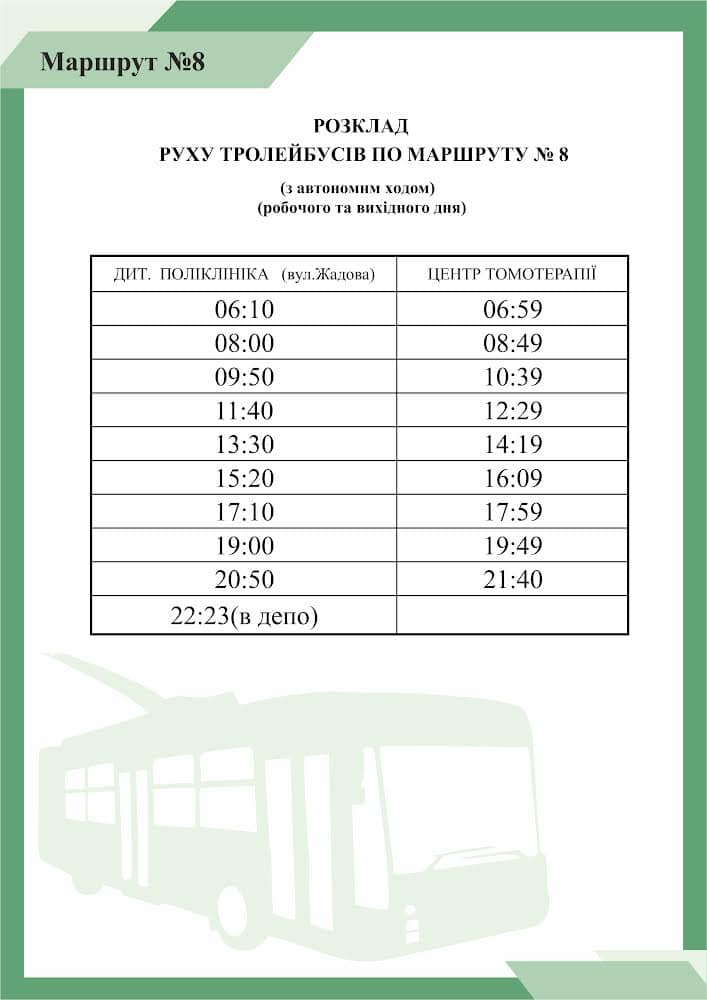 “З метою покращення транспортного обслуговування мешканцiв мiкрорайону Катранiвка тролейбусний маршрут 8 буде працювати за графiком, який дiяв на 01.10.2023 року”.