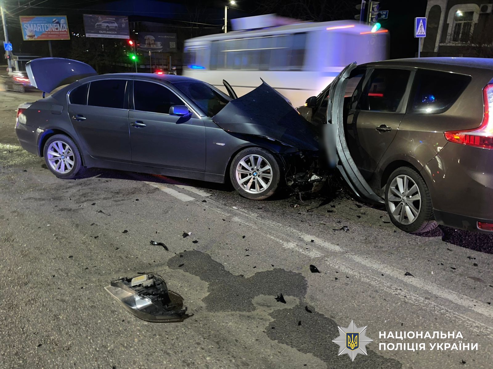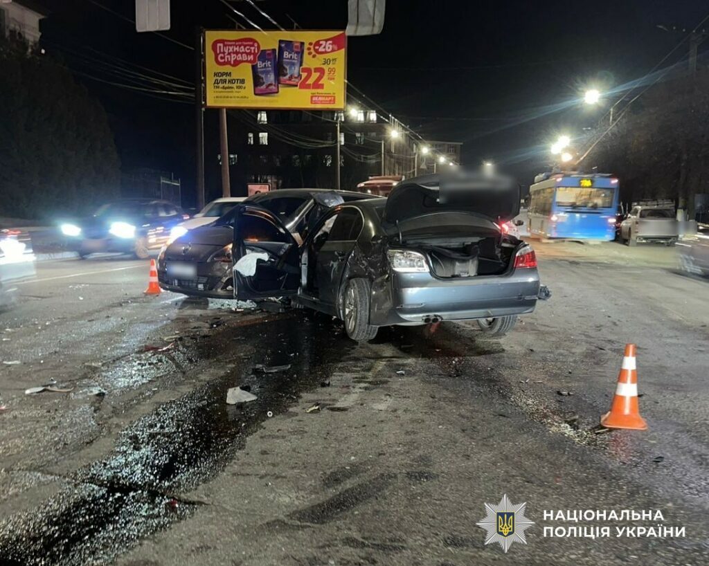 Після зіткнення автомобіль «BMW 525» здійснив наїзд на транспортний засіб «Renault Scenic» під керуванням водія 2000 року народження, який зупинився на червоний сигнал світлофора по вулиці Соборна.