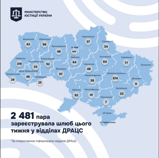 Упродовж минулого тижня співробітники органів державної реєстрації актів цивільного стану Мін’юсту видали 2481 свідоцтво про шлюб.