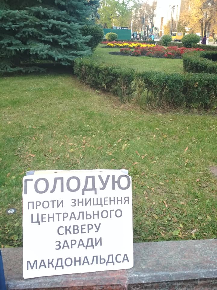 Кропивницька активiстка Надiя Паливода сьогоднi, 25 жовтня, оголосила голодування. Таким чином жiнка протестує проти знищення Центрального скверу заради будiвництва на його мiсцi МакДональдзу.