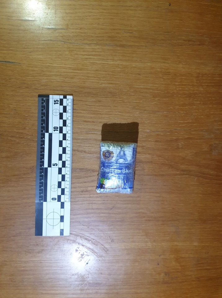 По прибуттю на мiсце пригоди слiдчо-оперативної групи працiвниками полiцiї було проведено особистий огляд громадянина, в результатi якого iз його правої кишенi було вилучено згорток, обмотаний прозорою клейкою стрiчкою, в якому знаходилось 6 полiетиленових пакетикiв типу zip-lock з кристалоподiбною речовиною бiлого кольору, а також один паперовий згорток з речовиною рослинного походження в подрiбненому станi сiро-зеленого кольору з характерним запахом.