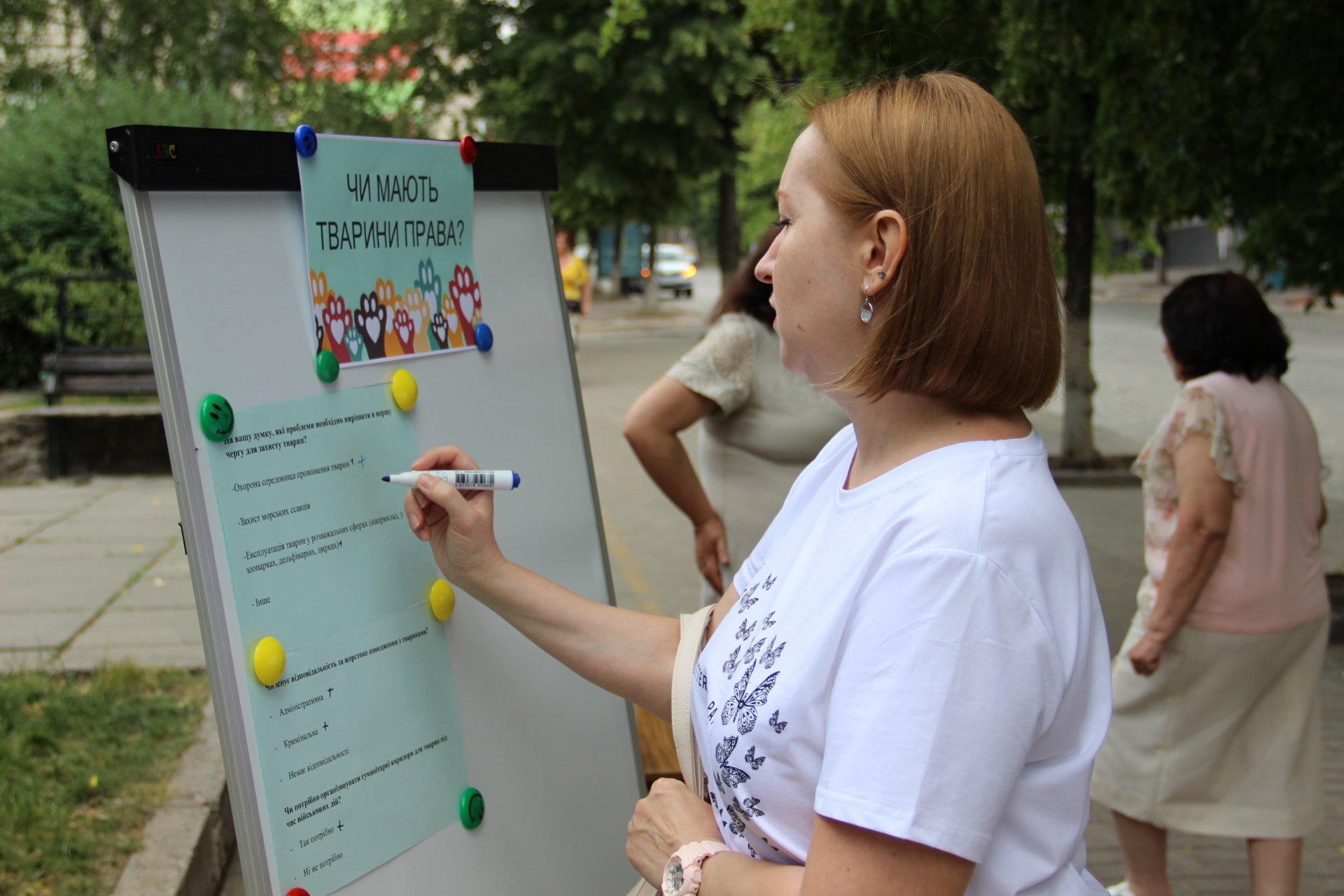 На прибудинковій території бібліотеки ім.Д.Чижевського відбулась вулична акція “Чи мають тварини права?”, яку провели працівники Орхуського центру екологічної інформації.