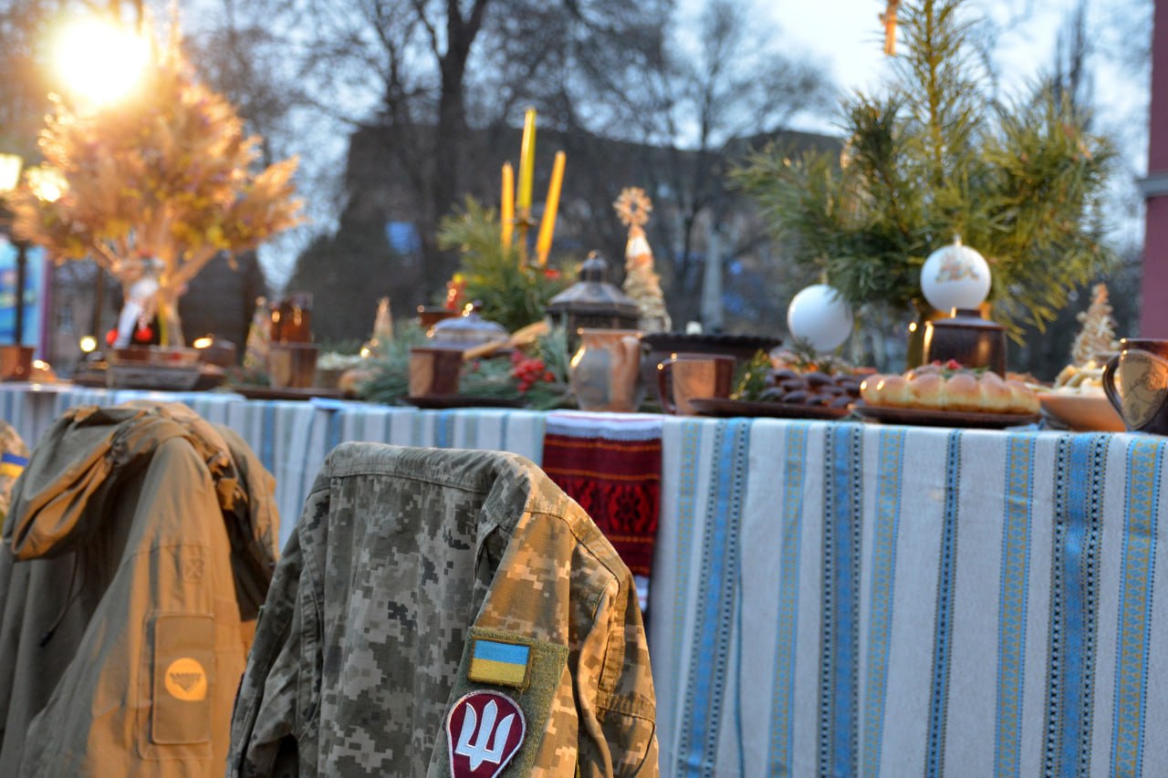На Театральній площі облаштували стіл із дванадцятьма різдвяними стравами, навколо якого – дванадцять стільців із кітелями загиблих захисників України. Пам’ять полеглих воїнів учасники акції вшанували запаленими свічками…