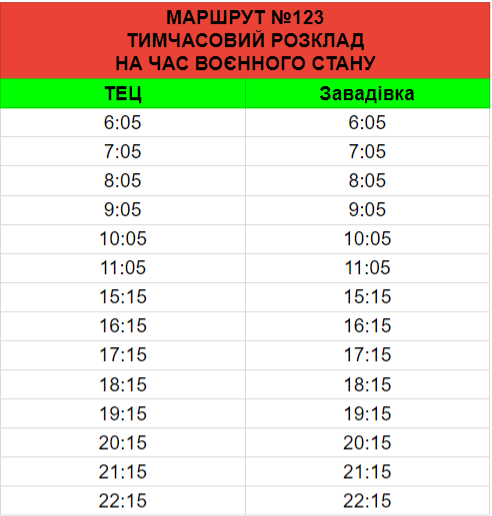 З 29 серпня 2022 року маршрут №123 “ТЕЦ — Завадівка” буде працювати за новим розкладом.