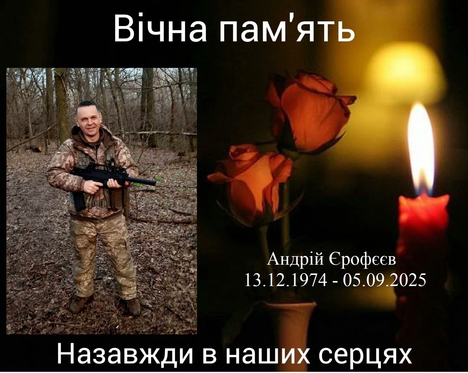 Свiй останнiй бiй сержант Андрiй Єрофєєв прийняв 05 вересня 2025 року, зупиняючи росiйських агресорiв бiля населеного пункту Вовчанськ Чугуєвського району Харкiвської областi.