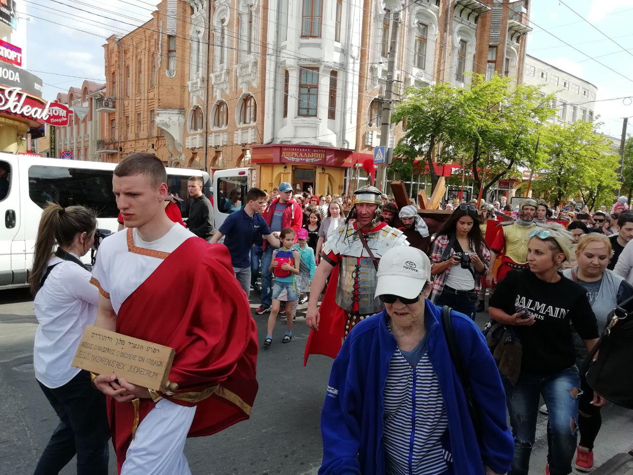 Сьогодні, 29 квітня, о 15:00 біля міської ради Кропивницького почалась реконструкція біблейських подій, пов’язаних із засудженням, розп’ яттям та воскресінням Ісуса Христа.
