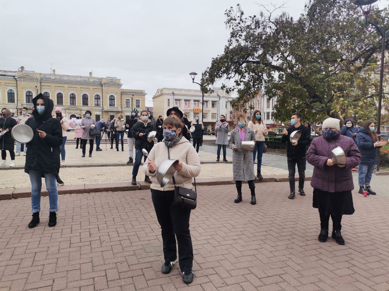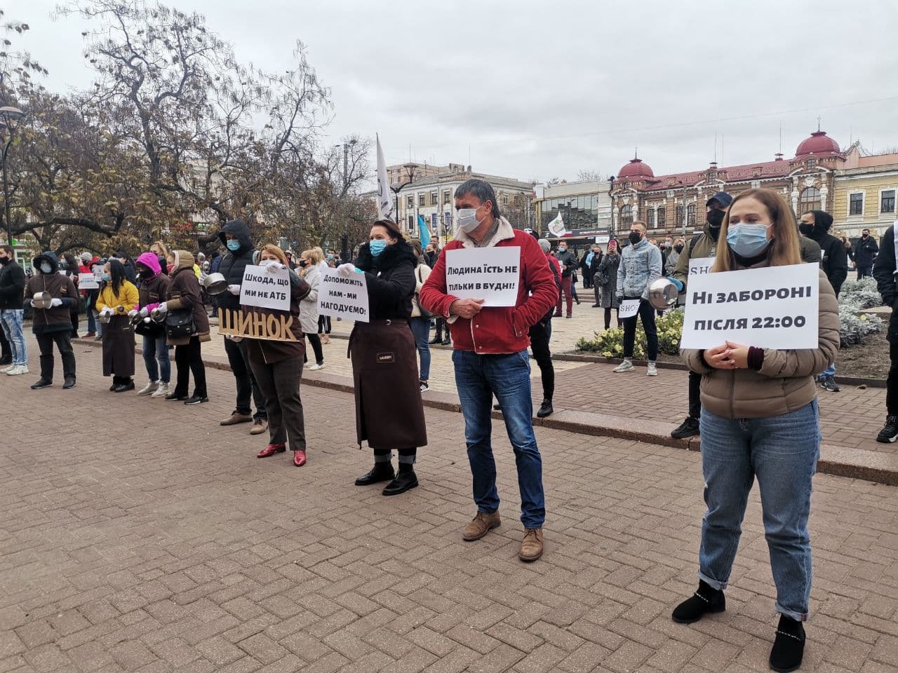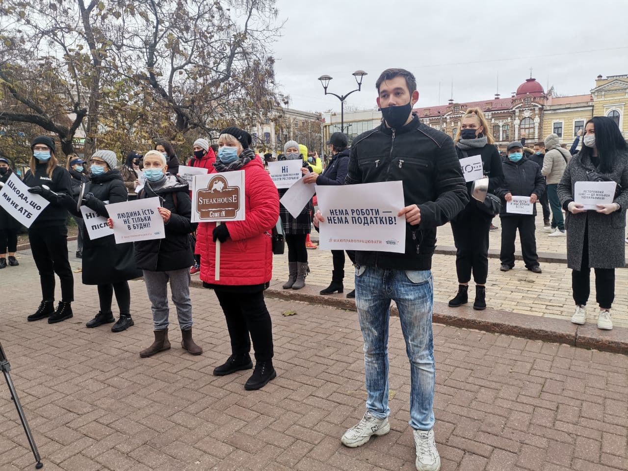 Вони тримають в руках транспаранти з написами “Люди їдять не лише у будні”, “Немає роботи – немає податків” тощо.