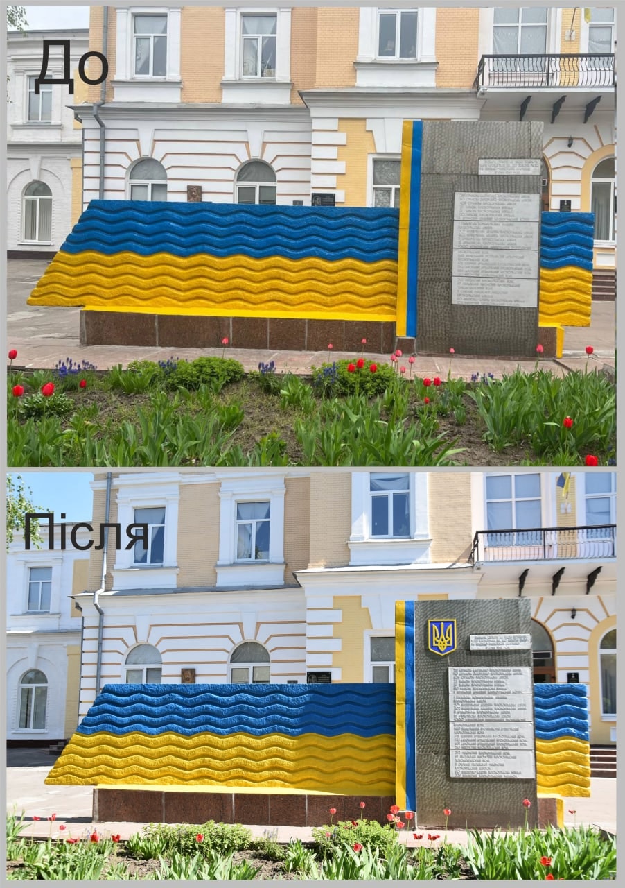 Рятувальники у Кропивницькому пофарбували стелу біля гарнізону у жовто-блакитні кольори, і також замінили радянську зірку на герб України.