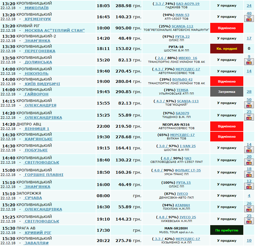 Так, скасували деякi рейси у напрямку Києва, Сум, Жовтих Вод, Луцька, Харкова, Вiнницi тощо.