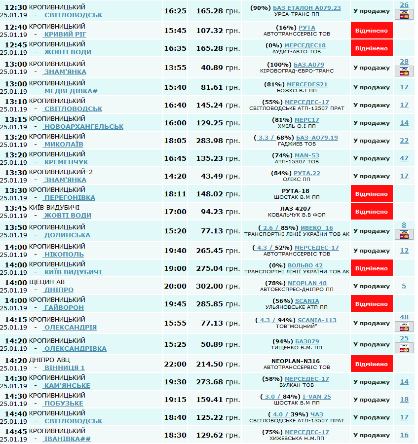 Так, скасували деякi рейси у напрямку Києва, Кривого Рогу, Днiпра, Чернiвцiв, Свiтловодська, Вiнницi, Миколаєва, Сум, Жовтих Вод, Харкова, Свiтловодська тощо.