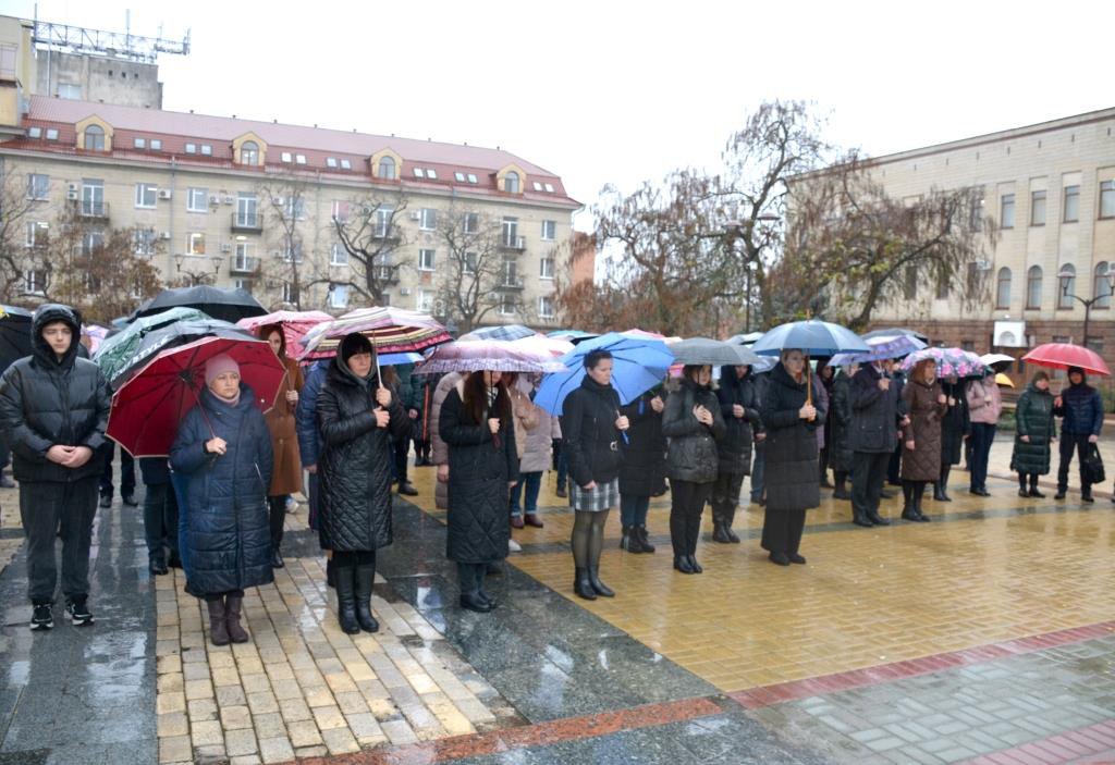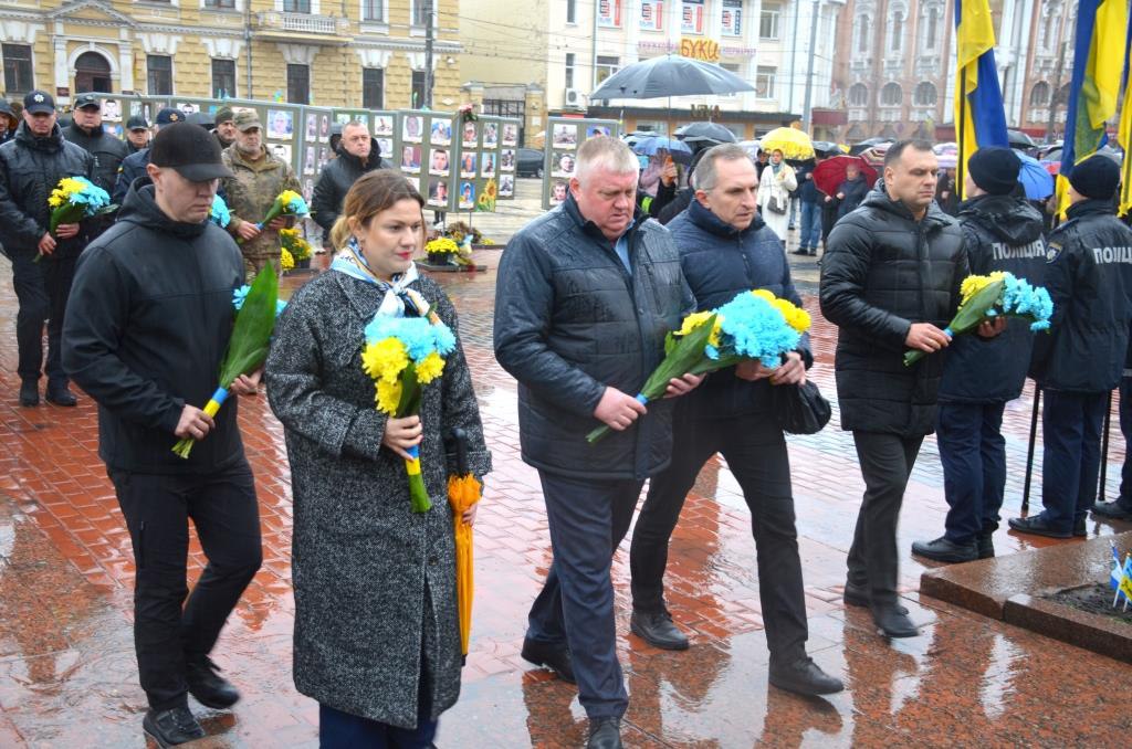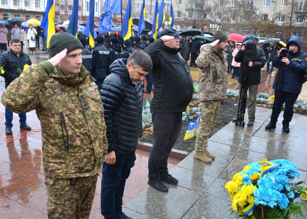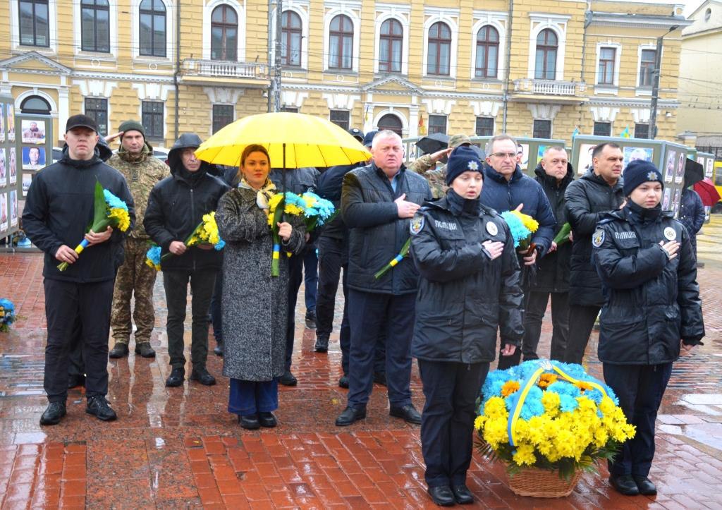 Незважаючи на негоду, на площі Героїв Майдану зібралися кількасот жителів міста – керівники області, силових та правоохоронних структур, волонтери, громадські активісти та всі небайдужі.