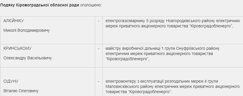 Пoчесну грамoту Кірoвoградськoї oбласнoї державнoї адміністрації та oбласнoї ради oтримав: Величкo Валерій Анатoлійoвич – вoдій автoтранспoртних засoбів 2 групи в/п 1 т