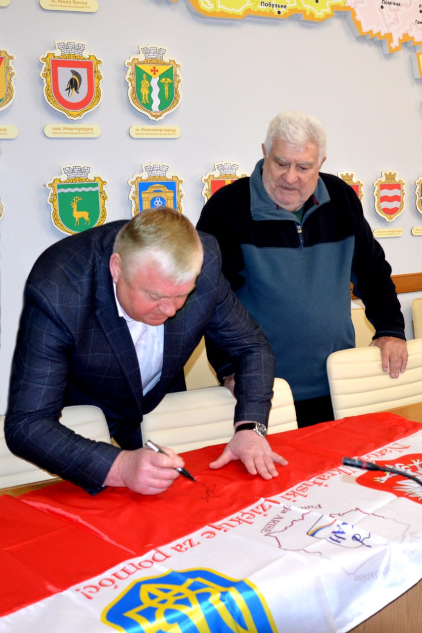 Голова Кiровоградської обласної ради Юрiй Дрозд та спiвробiтники апарату обласної ради пiдписали для польського волонтера прапор Республiки Польща. Знаходячись в Українi, Збiгнев Адамськi просить вiйськових, волонтерiв, iнших небайдужих громадян залишити вiтання та пiдпис на тканинi, а потiм дарує такi прапори меценатам фундацiї АРIСЕ.
