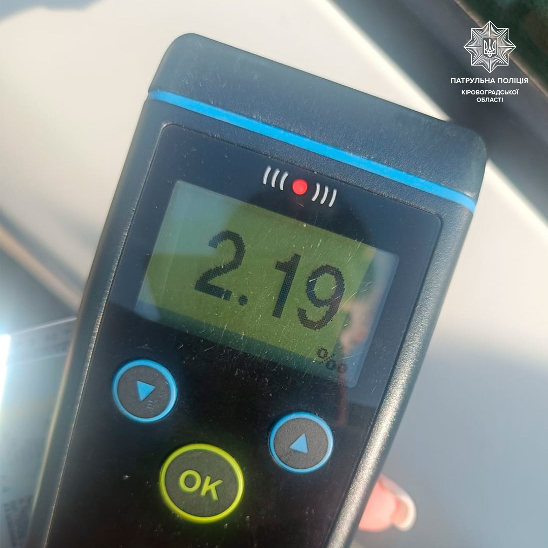 Після повідомлення на лінію 102 на місце негайно прибули патрульні. У водія Jeep інспектори одразу виявили ознаки сп’яніння. Перевірка за допомогою алкотестера Драгер показала 2,19 проміле, що майже в 11 разів перевищило допустиму норму.