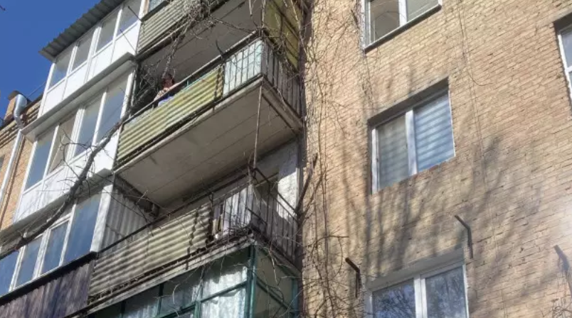 Старенька перехилилася через балкон, втративши рiвновагу, та повисла на балконнiй огорожi, тримаючись за неї руками.