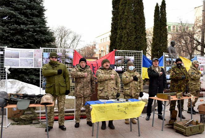 Також на площi перед мiськрадою органiзували виставку – iнсталяцiї фронтових артефактiв, бойових прапори добровольчих батальйонiв та польового спорядження i амунiцiї учасникiв АТО, привезених бiйцями з фронту.