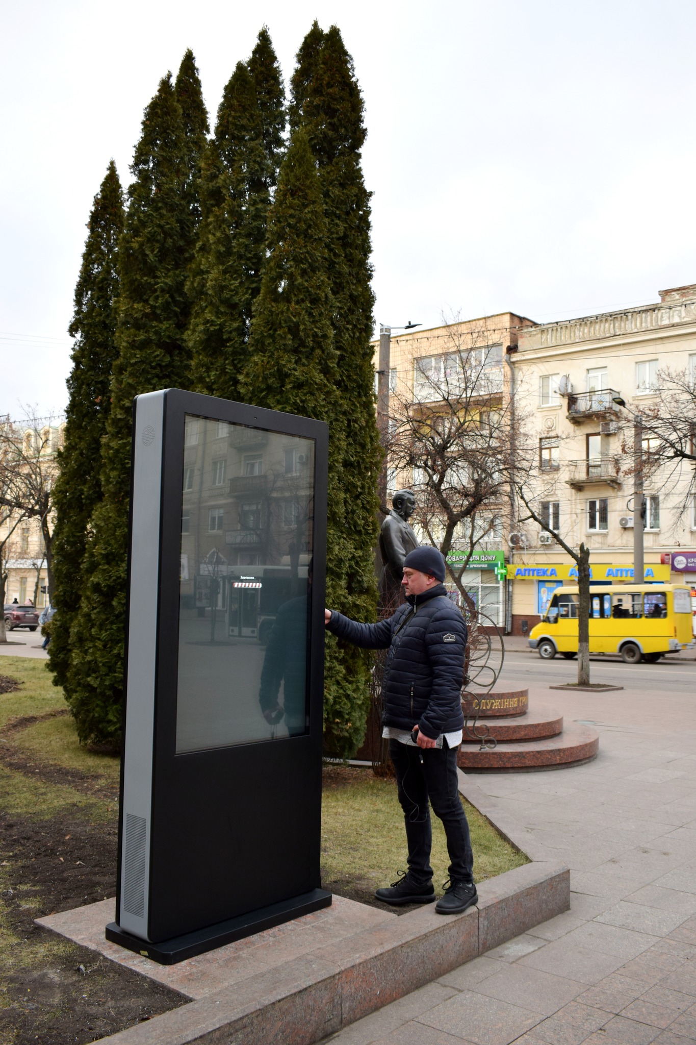 “Коли планували встановлення такого екрану, обговорювали різні варіанти, але обрали саме такий, який вписується в архітектурний ансамбль площі перед міською радою і є доступним для всіх містян, у тому числі для людей із інвалідністю”, – зазначила Юлія Вовк. – Відстань до екрана дозволяє торкатися рукою з крісла колісного.