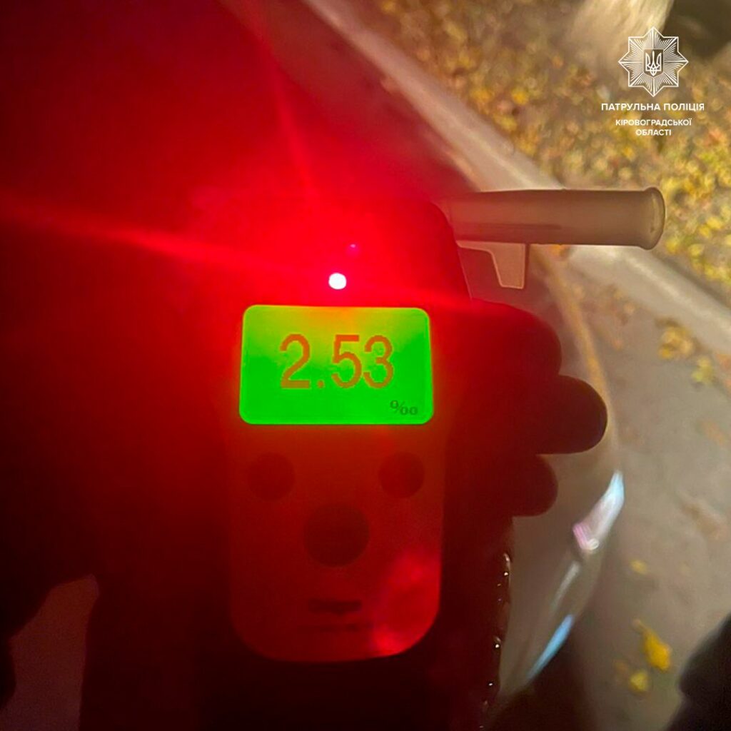 Мiстянин погодився пройти огляд на стан сп’янiння. Прилад Драгер показав 2,53 промiле, що майже в 13 разiв перевищило допустиму норму.
