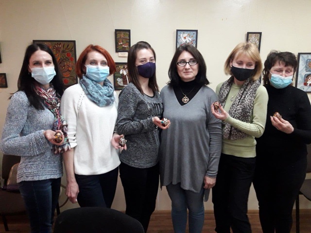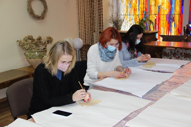 Пiд час майстер-класу вiдвiдувачки бiблiотеки малювали на яйцi берегиню та включили у розпис елемент крапання для створення символу Всесвiту.