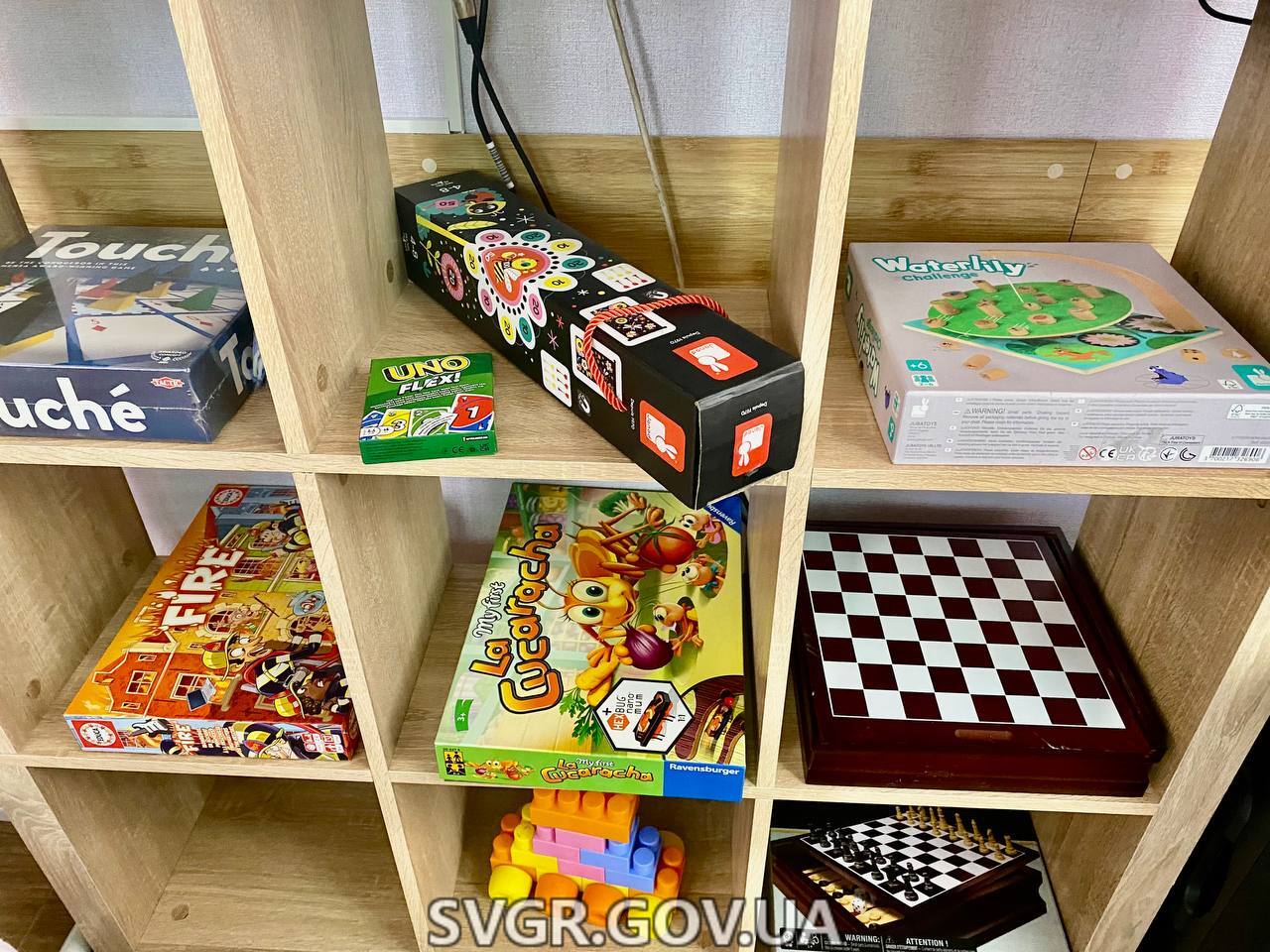 У дитячому просторi є все необхiдне для дозвiлля дiтей: iграшки, розвивальнi книжки, настiльнi iгри, а також м’якi крiсла.