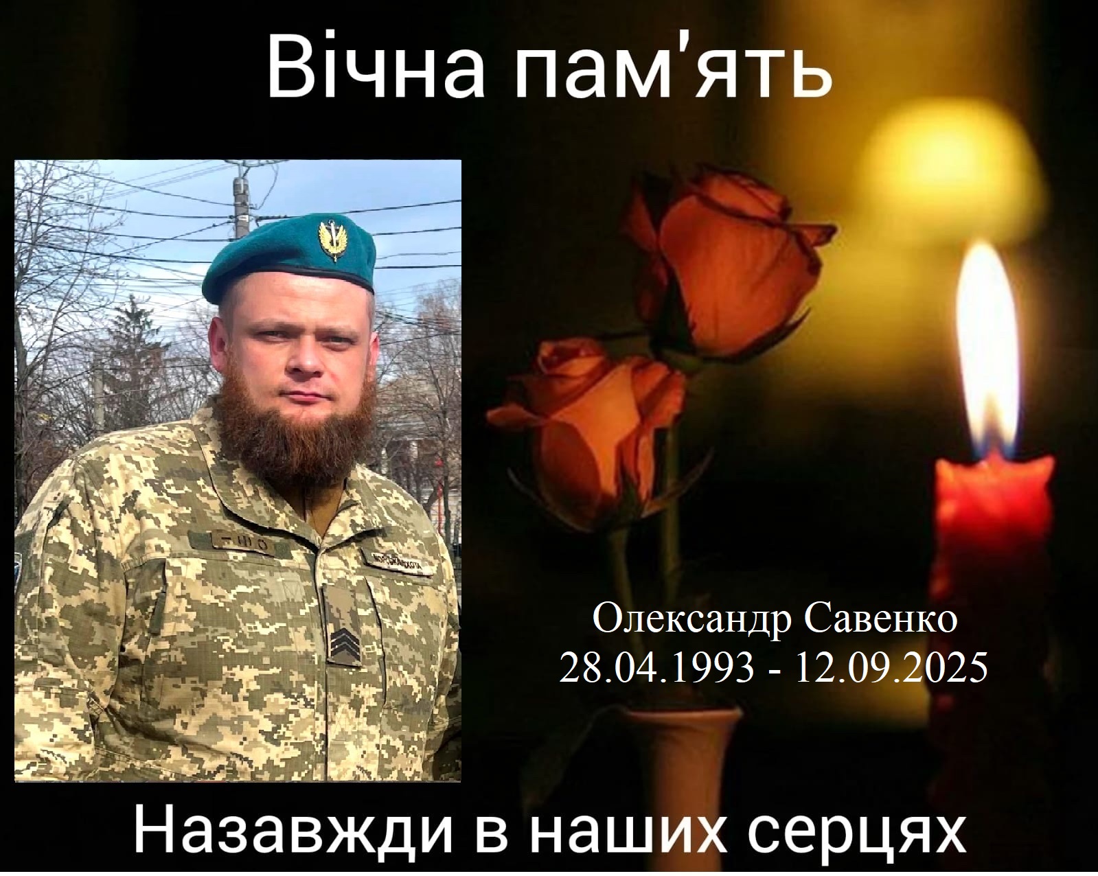 Сержант Олександр Савенко народився 28 квітня 1993 року. Був інструктором навчальної роти школи загальновійськової підготовки. Загинув 12 вересня 2025 року від отриманих поранень, внаслідок удару ворожого БПЛА.