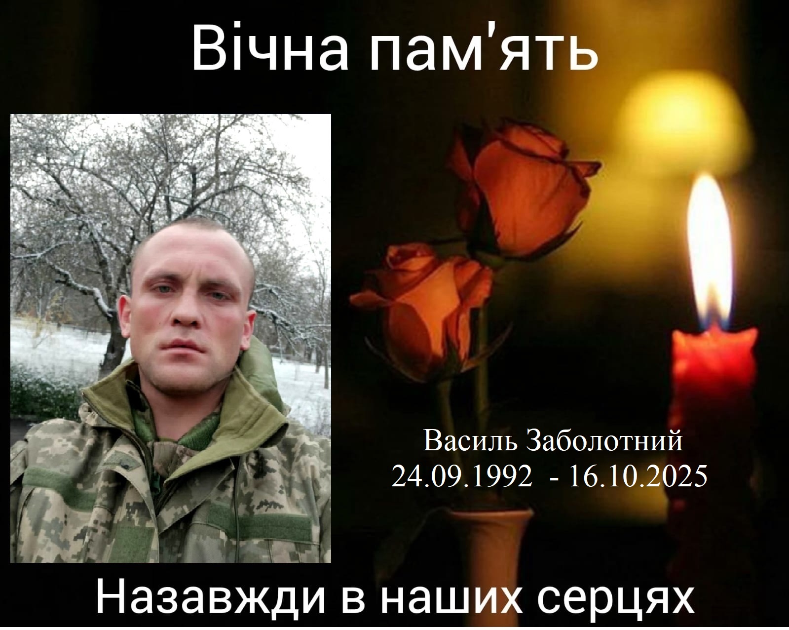 Солдат Василь Заболотний, 1992 року народження, загинув під час виконання обов’язків військової служби 16 жовтня 2025 року.