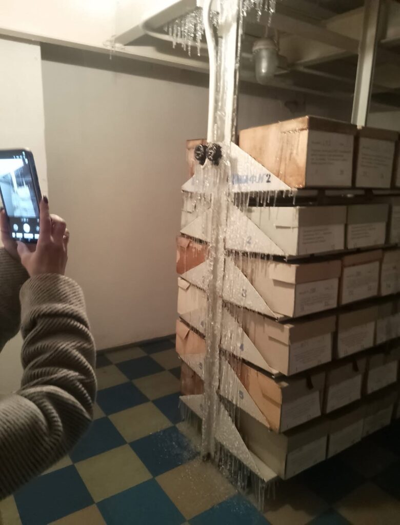 Силами працівників архіву частину пошкоджених документів переміщено в робочі кімнати першого поверху будівлі для просушування, але документи наскрізь промоклі, картонажі вкриті кригою.