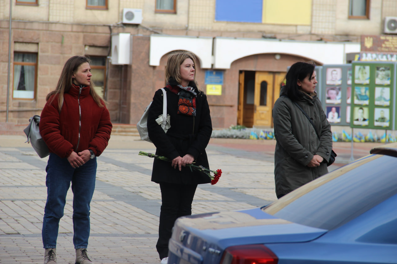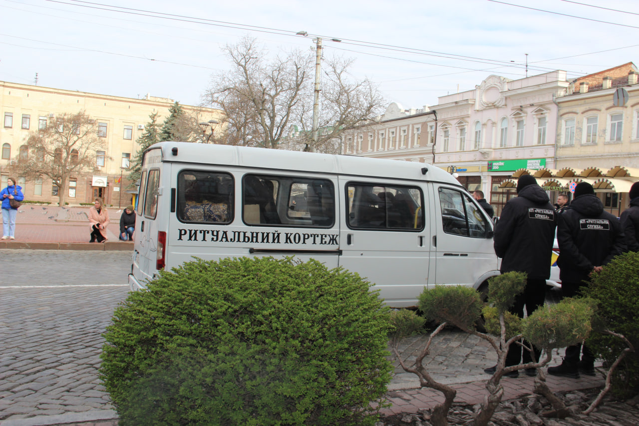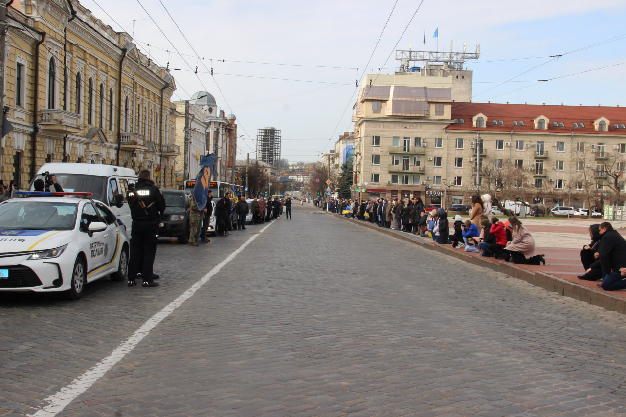 Траурний кортеж зупинився бiля площi i кропивничани, ставши на колiно, вiддали данину пам’ятi 21-рiчному воїну, iнформує Златопiль.