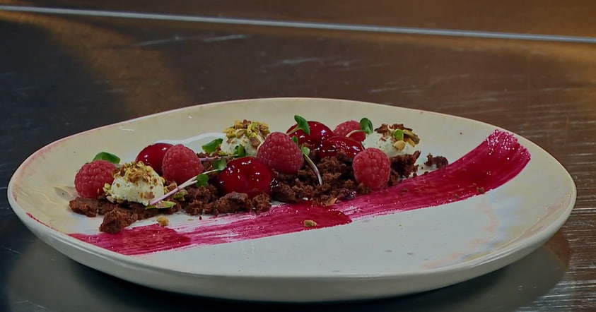 ”Мус ”Мохіто”, який прикрашений соленою фісташкою та крамб шоколадний. Знала, що хочу приготувати десерт, коли їхала з Іспанії, зрозуміла, що люблю мохіто з полуницею, або ж з малиною. Так і виникла ідея цього десерту”,- зазначила учасниця проєкту презентуючи страву.