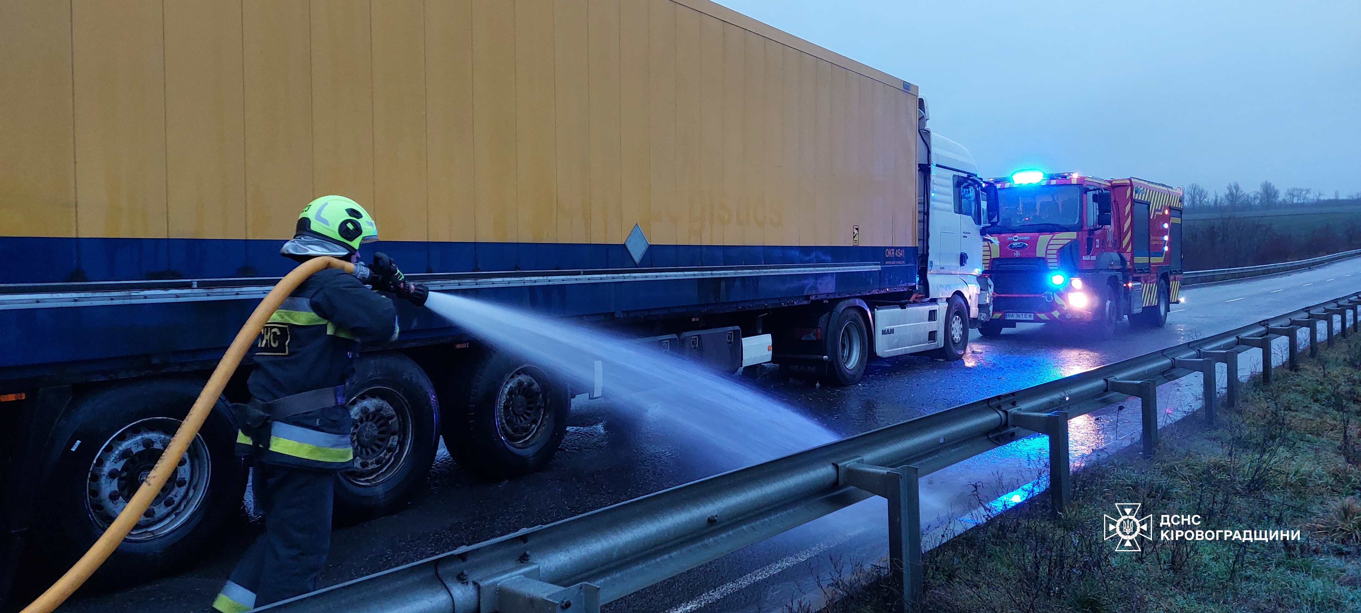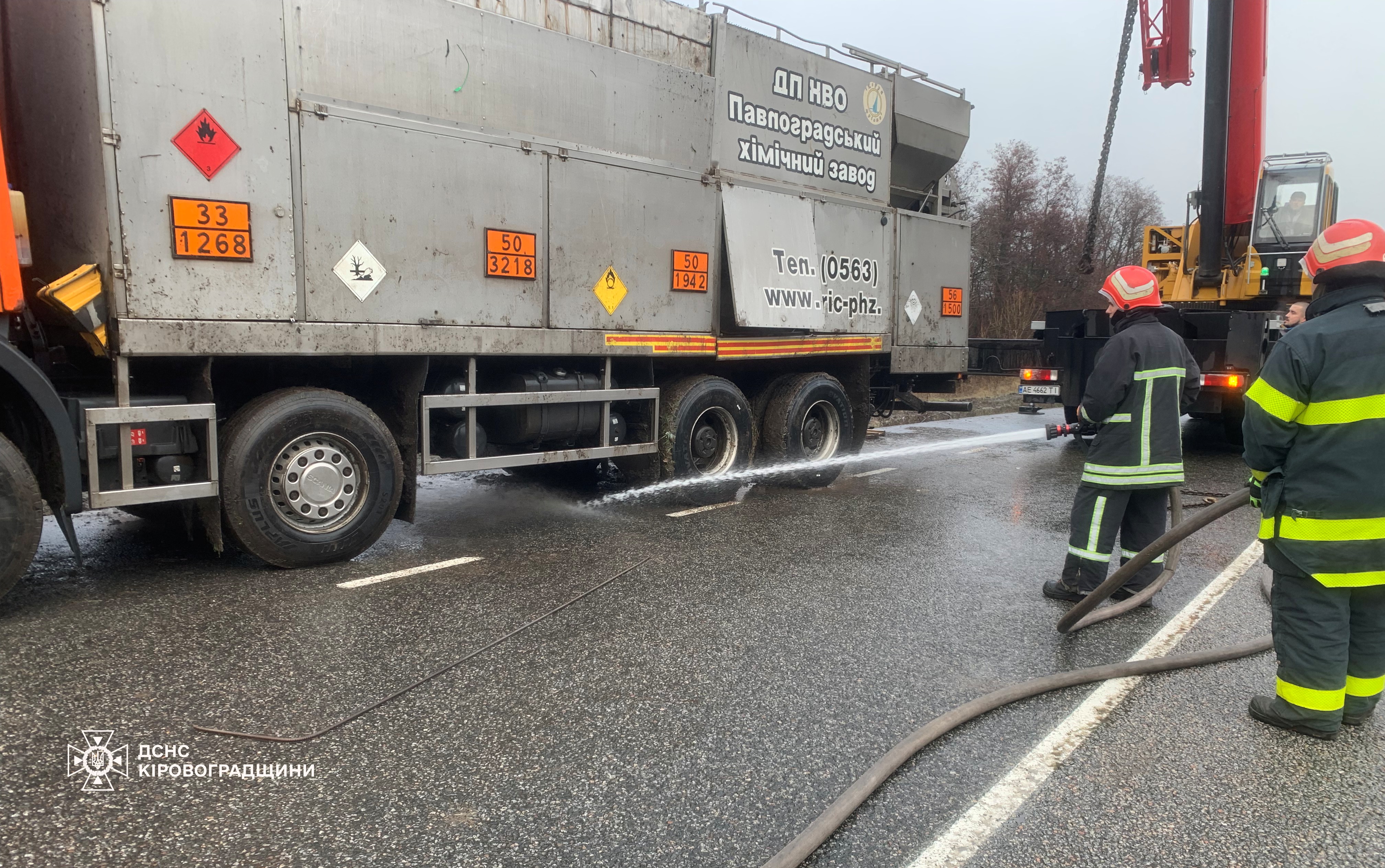 Пiсля прибуття до мiсця виклику бiйцi кропивницького пiдроздiлу забезпечували пожежну безпеку пiд час пiдйому автокраном вантажного автомобiля з кювету, встановили авто на шасi та змили пально-мастильнi матерiали з дорожнього покриття.