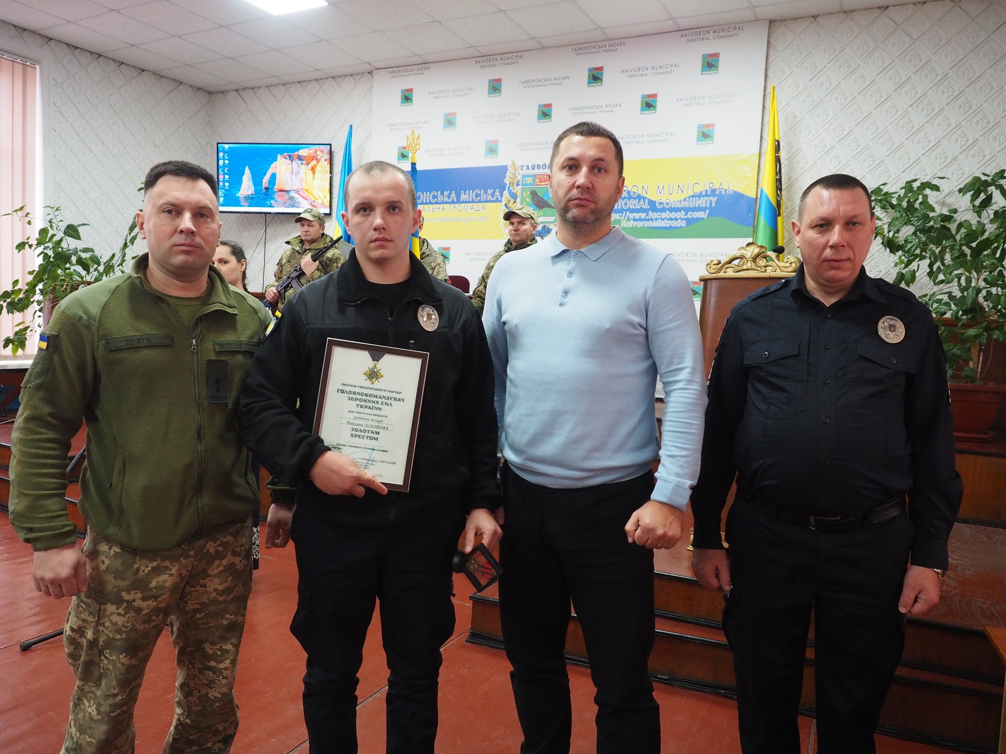 Вiдповiдно до наказу Головнокомандувача Збройних Сил України за проявлений героїзм i мужнiсть пiд час захисту державного суверенiтету та територiальної цiлiсностi України вiйськовою нагородою Збройних Сил України «Золотий Хрест» нагороджено учасникiв бойових дiй, працiвникiв вiддiлення полiцiї № 1 Голованiвського районного вiддiлу полiцiї: