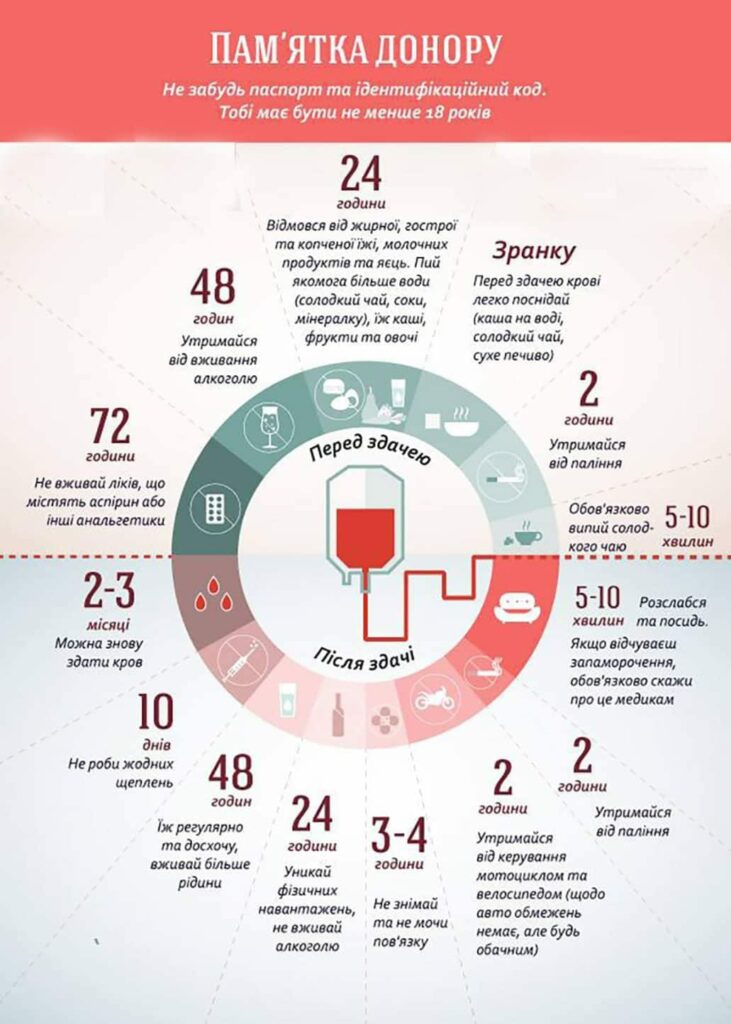 “Не забувайте, що варто дотримуватись рекомендацiй лiкарiв при пiдготовцi до здачi кровi та пiсля її забору. До процедури донацiї випийте обов’язково склянку соку, води або чаю. Зранку в день здачi кровi рекомендується легкий снiданок – солодкий чай з хлiбом або печивом”.