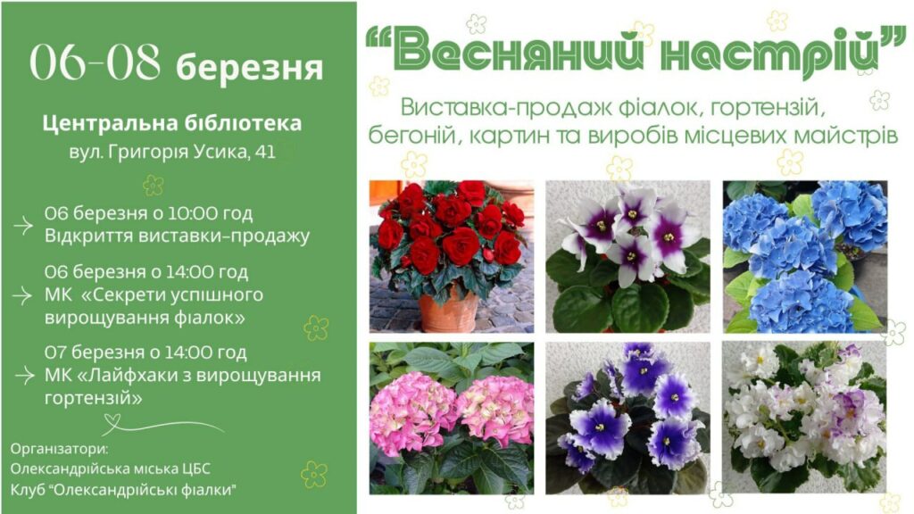 “Запрошуємо вас на неймовiрну подiю. Тут ви зможете насолодитися красою понад 70 рiзновидiв фiалок, гортензiй, бегонiй, представлених мiсцевими селекцiонерками”.
