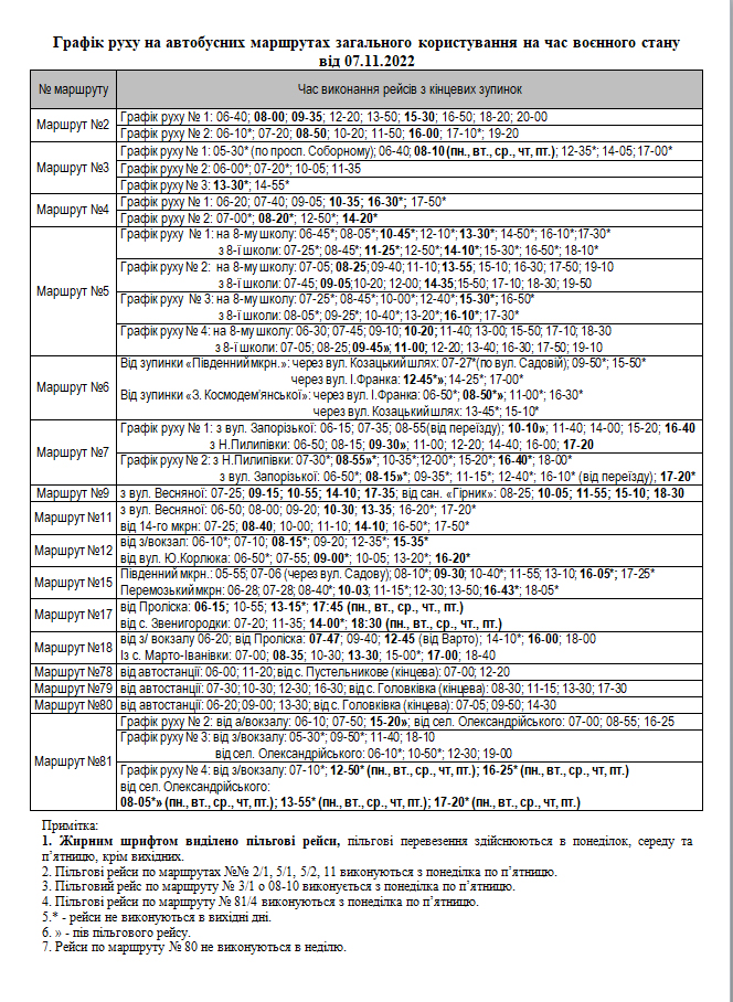 На сайті Олександрійської міської ради оприлюднили графік руху на автобусних маршрутах загального користування на час воєнного стану від 07.11.2022 року.