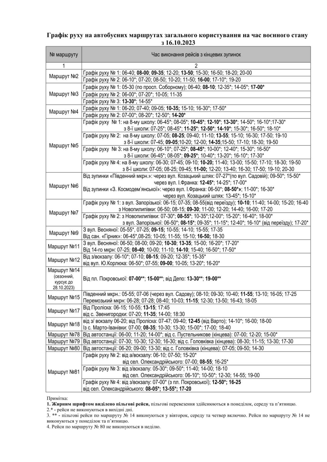 Жирним шрифтом виділено пільгові рейси, пільгові перевезення здiйснюються в понедiлок, середу та п’ятницю, крім вихідних.