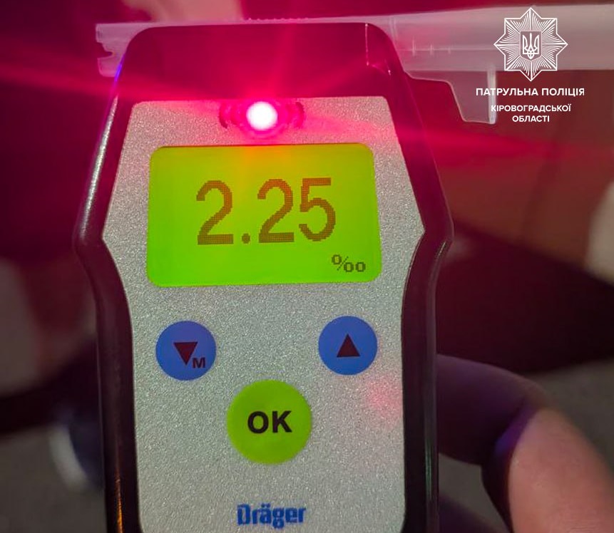 Результат приладу Драгер — 2,25 проміле. Це у понад 11 разів більше допустимої норми.
