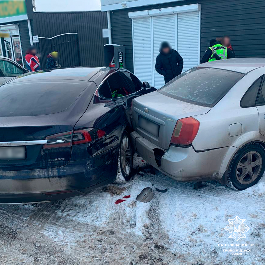 Водiйка автомобiля Chevrolet Lacetti пiд час повороту праворуч не дотрималася безпечної швидкостi руху, не врахувала дорожню обстановку, виїхала за межi проїзної частини та скоїла наїзд на припаркований легковик Tesla Model S i ролет магазину.