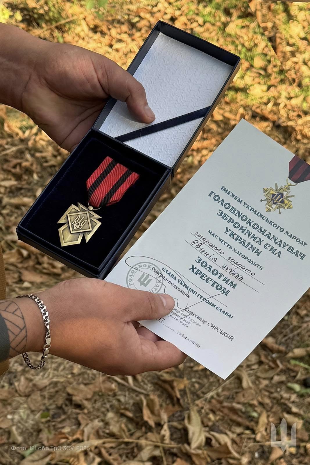 Боєць 121-ї окремої бригади територiальної оборони отримав вiдзнаку «Золотий Хрест» вiд Головнокомандувача Збройних Сил України.