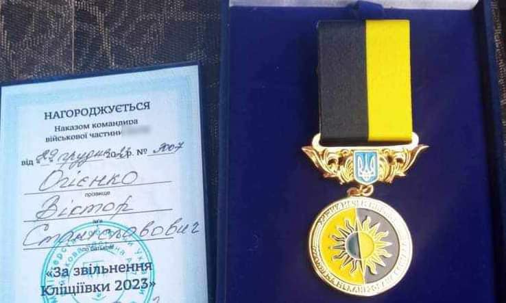 Воїна вiдзначили за вiйськову службу – почесним нагрудним знаком Головнокомандувача Збройних Сил України «Золотий хрест» та медаллю «За звiльнення Клiщiївки – 2023».
