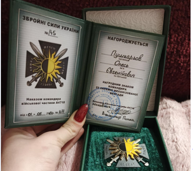 Воїна нагородили нагрудним знаком командира 22 ОМБ Збройних Сил України.