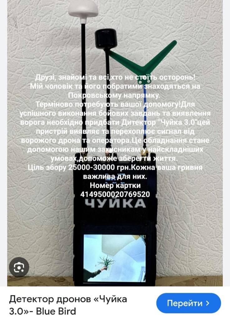 “Мій чоловік та його побратими знаходяться на Покровському напрямку і терміново потребують допомоги! Для успішного виконання бойових завдань та виявлення ворога необхідно придбати Диетектор “Чуйка 3.0″. Цей пристрій виявляє та перехоплює сигнал від ворожого дрона та оператора”, – зазначає дружина захисника.