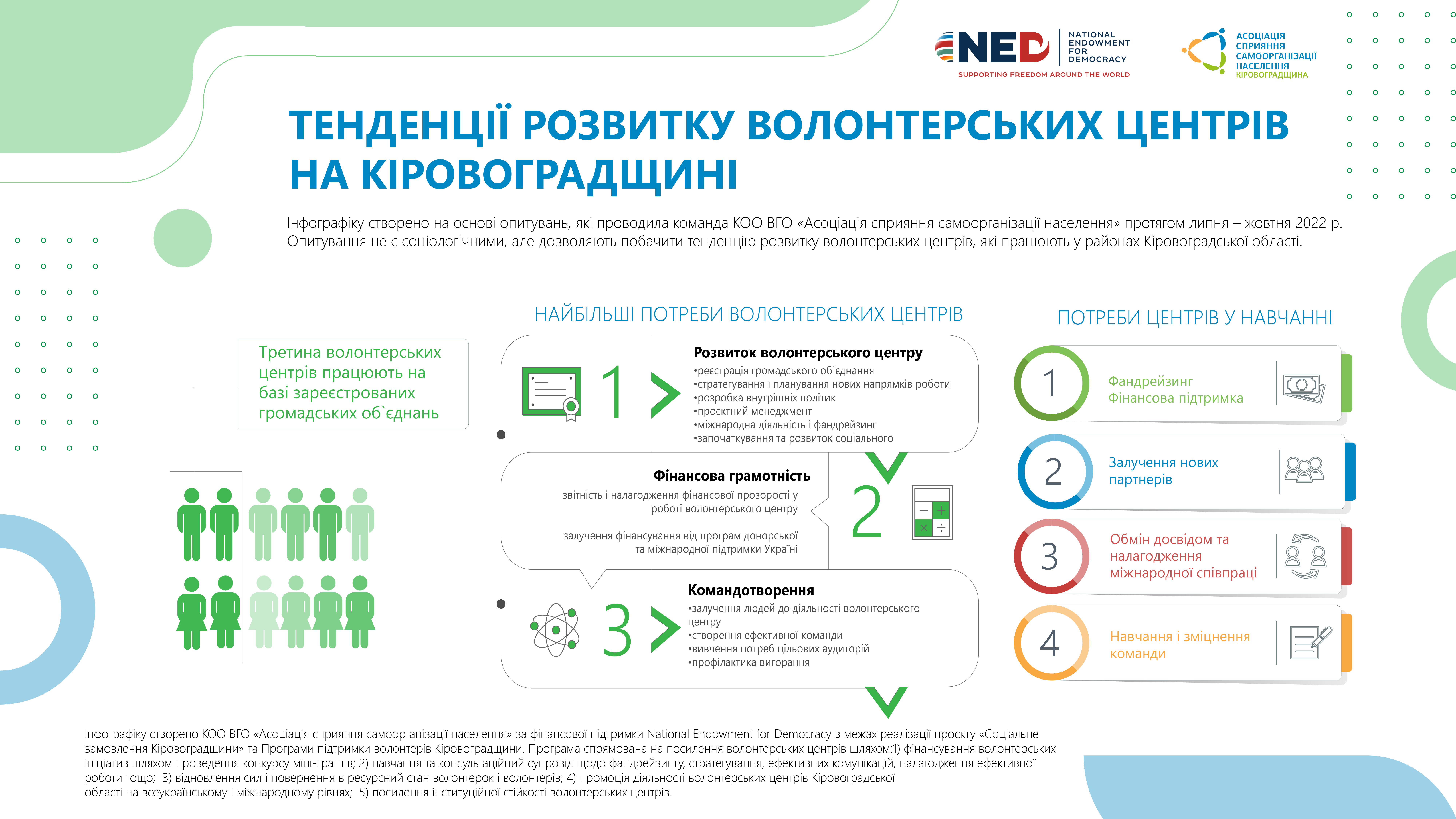 Тільки третина волонтерських центрів на Кіровоградщині працюють на базі зареєстрованих громадських об’єднань. А найбільшими їхніми потребами є організаційний розвиток, формування ефективної команди, а також посилення фінансової грамотності всередині волонтерського центру.