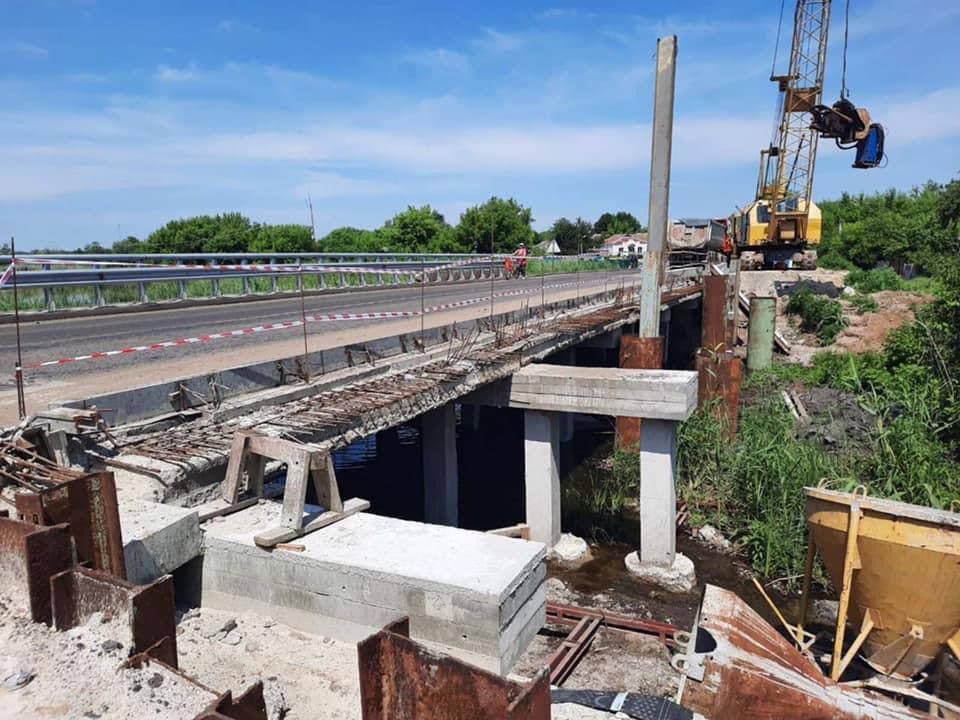 На двох мостах бiля Обознiвки на об’їзнiй дорозi Кропивницького влаштовують армокаркас та готують до монтажу перехiднi плити.