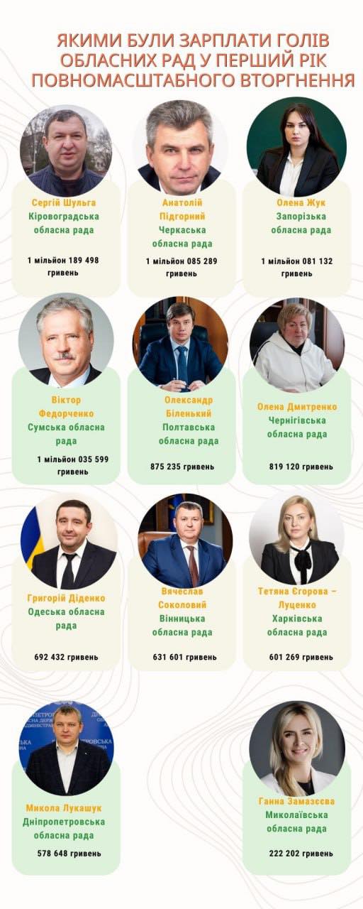 У трійці лідерів голова Запорізької обласної ради Олена Жук. Її зарплата за 2022 рік склала 1 мільйон 081 132 гривень.