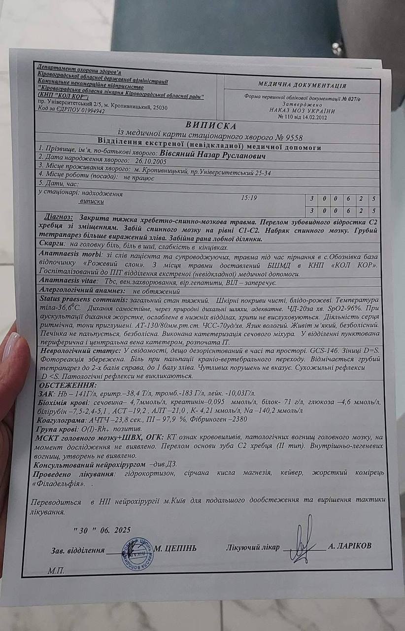 Назар у реанімації Інституту нейрохірургії ім. Ромоданова в Києві. Йому вже провели складну операцію: стабілізацію хребта та декомпресію спинного мозку. Прогнози лікарів поки не дають надії – стан вкрай важкий.