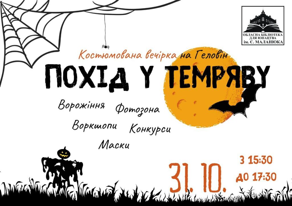 31 жовтня о 15:30 Кіровоградська обласна бібліотека для юнацтва запрошує молодь та юнацтво на костюмовану вечірку до Геловіну “Похід у темряву”.