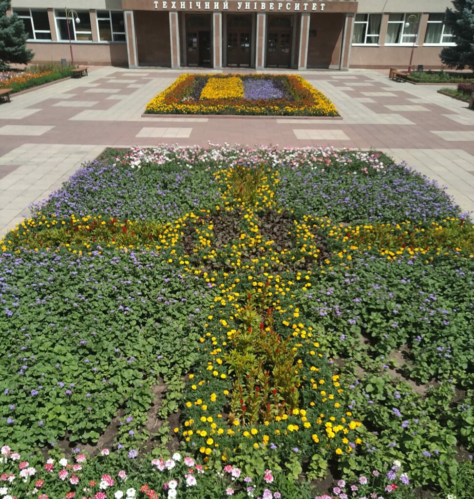 У ЦНТУ садiвники створили з квiтiв хрест Збройних сил України та державний прапор.