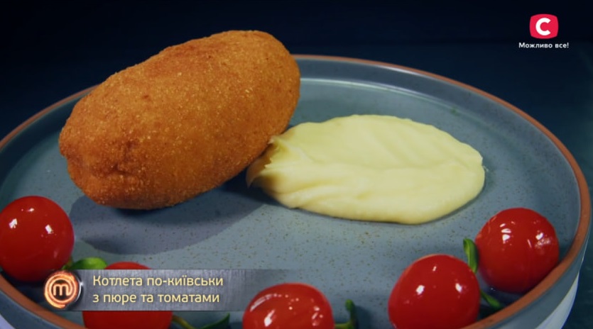“Думав, мудрував, що приготувати, чим здивувати. Спочатку хотів зробити стейк, потім вирішив, що це занадто просто. Тому обрав котлету по-київськи, але не звичайну. Середину я не робив класичною, а зробив з вершково-сирною начинкою та зеленню. Для цього обрав сир дроблю. Також приготував вершкове пюре і томати з часником, які легенько припустив на грилі”,- так описав свою страву учасник.